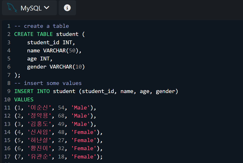 아래 코드는 미리 작성해둔 코드이다. CREATE TABLE 및 INSERT INTO 를 편하게 할 수 있도록 작성해 두었다.
